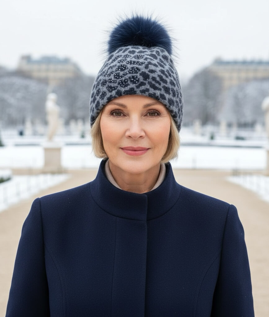 Aplicatia laterala cu strasuri discrete nu domina designul, ci il completeaza subtil. Micile accente luminoase contrasteaza delicat cu tonurile de gri si bleumarin, adaugand un plus de expresivitate fara a incarca modelul. Caciula de dama cu pompon din blanita Derina 1 pastreaza astfel un echilibru intre stilul modern si detaliile feminine.
