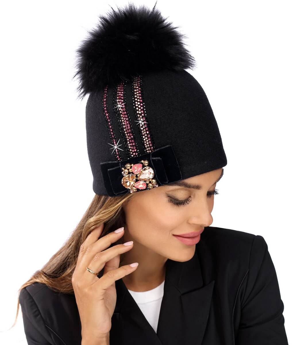 Fundita stilizata din catifea, situata in partea laterala, este completata cu o bogata aplicatie de strasuri si cristale multicolore, care stralucesc in razele de lumina si confera un plus de rafinament. Pomponul supradimensionat din blanita naturala, adauga un aer usor tineresc si jucaus tinutelor pe care le completeaza. Acest pompon este detasabil, facilitand astfel curatarea si intretinerea.
