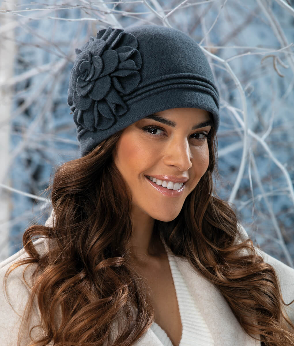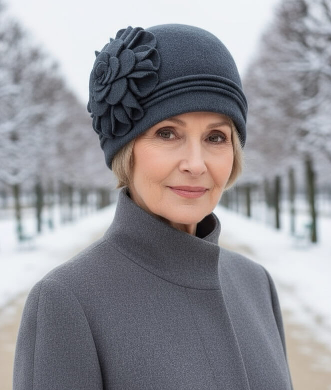 Elementul central al designului este floarea supradimensionata aplicata lateral, care adauga volum si expresivitate. Aceasta forma decorativa creeaza un punct de interes vizual si evidentiaza caracterul feminin al modelului. Amplasarea laterala permite ca decorul sa fie vizibil din diferite unghiuri, fara a incarca partea frontala. Caciula de dama Dorotea 4 capata astfel o identitate distincta, potrivita pentru femeile care apreciaza accesoriile cu detalii bine definite.