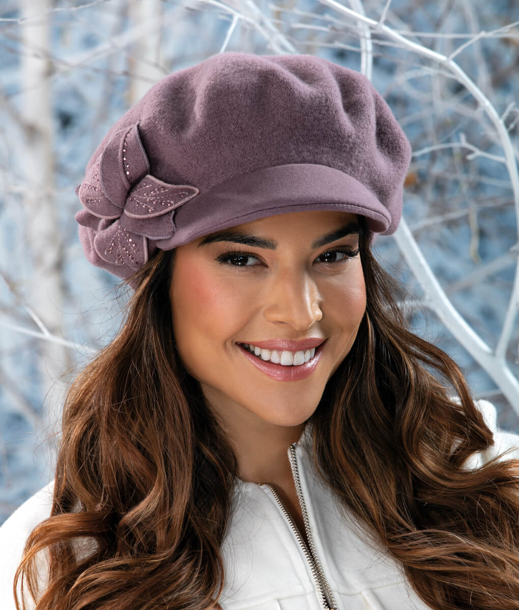 Designul este completat de un element decorativ elegant: o floare stilizata realizata din tricot, decorata cu strasuri fine. Aceasta aplicatie atrage discret privirea si adauga un accent feminin modelului. Strasurile ofera o nota subtila de stralucire, iar floarea stilizata pune in valoare textura tricotului si linia beretei. Prin acest detaliu decorativ, caciula de dama tip bereta cu cozoroc Avrelas 8 capata un aspect rafinat si distinct.