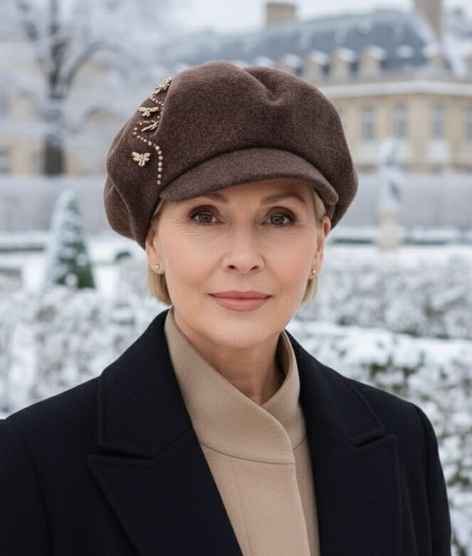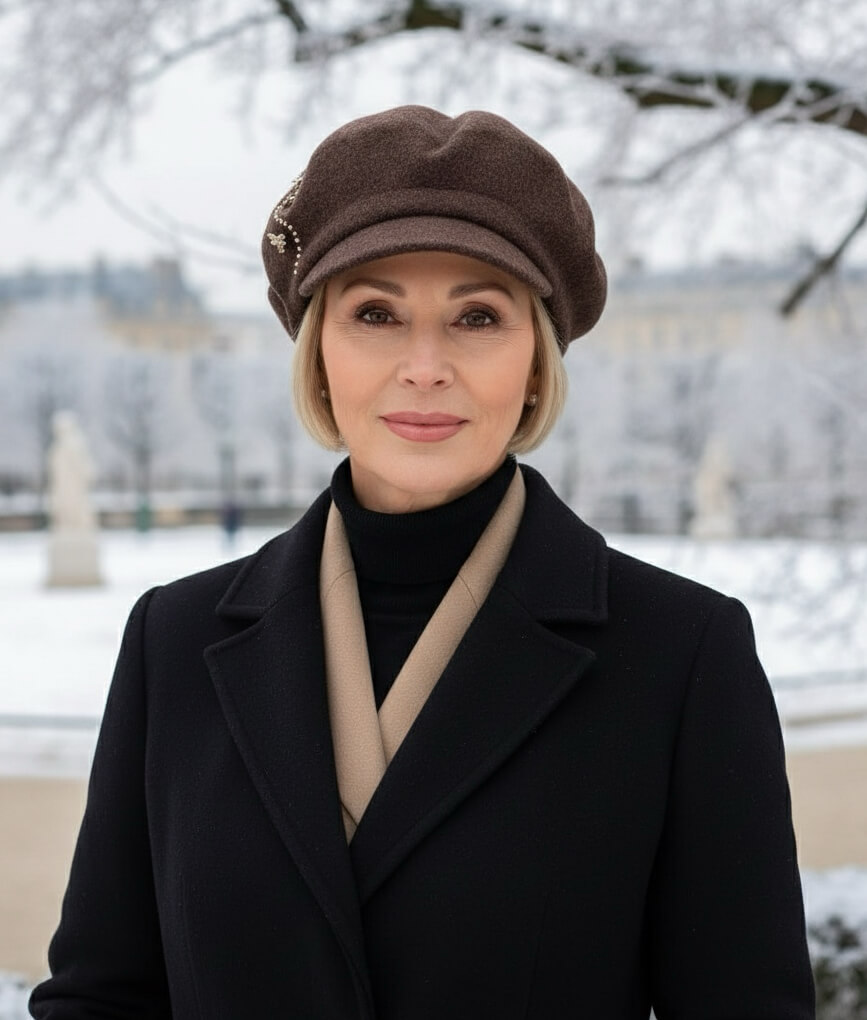 Culoarea maro inchis confera un aer sofisticat si versatil. Aceasta nuanta calda si profunda este usor de asortat cu paltoane bej, caramel, negre sau gri, dar si cu tinute in tonuri pamantii. Caciula de dama tip bereta cu cozoroc Cyprasa 5 in varianta maro inchis este ideala pentru un look elegant de zi cu zi, dar si pentru aparitii mai rafinate. Maroul inchis inspira stabilitate si bun gust, fiind o alegere potrivita pentru doamnele care prefera culorile clasice, dar expresive.