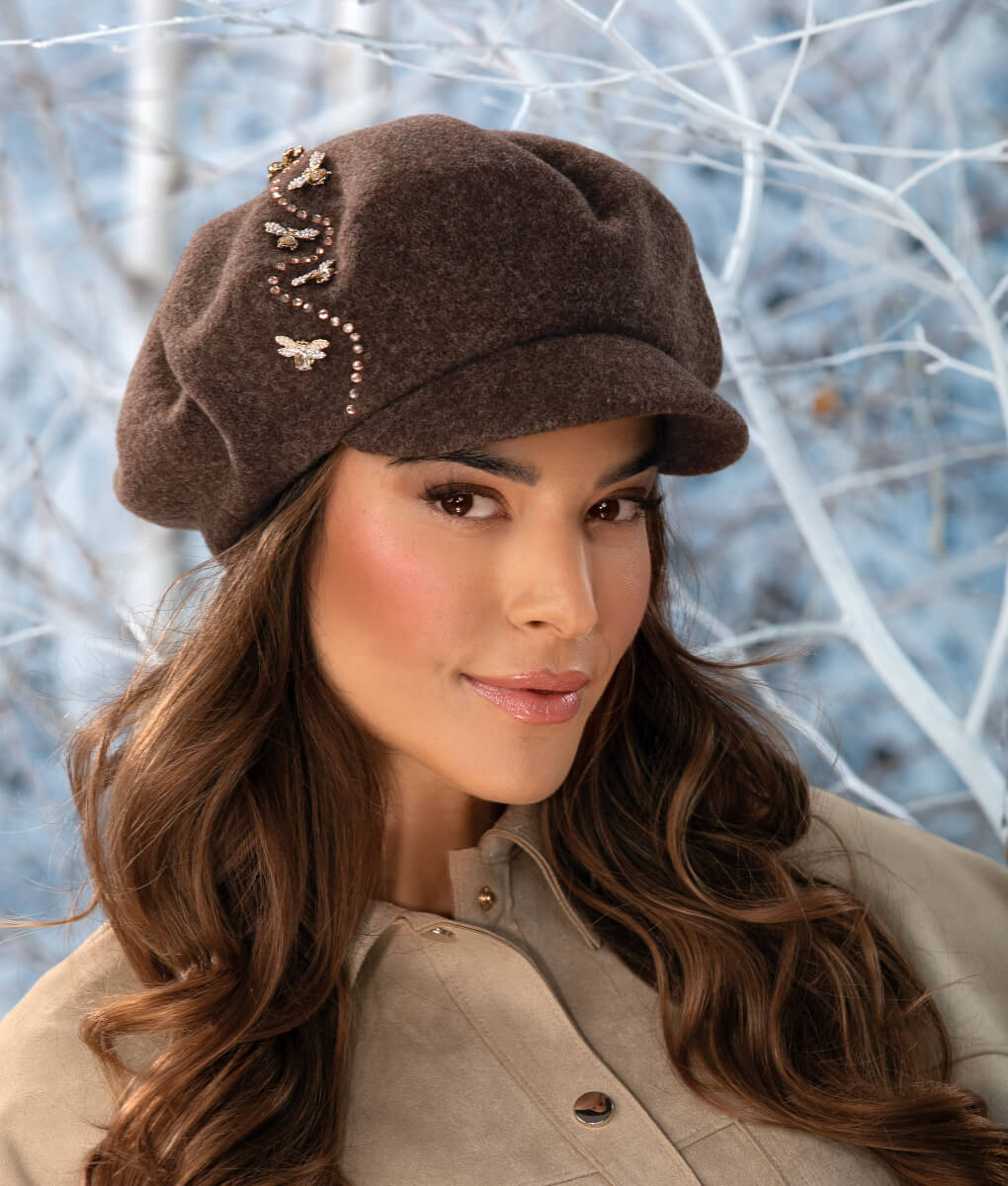 Designul este pus in valoare de decorul lateral cu strasuri si mici brose sub forma de albine. Aceste detalii elegante adauga o nota feminina si delicata, transformand caciula de dama tip bereta cu cozoroc Cyprasa 5 intr-un accesoriu cu personalitate. Strasurile ofera un efect subtil de stralucire, iar brosele in forma de albina completeaza armonios linia beretei, fara a incarca excesiv modelul. Este o combinatie reusita intre finete si expresivitate, potrivita pentru femeile care apreciaza detaliile deosebite.