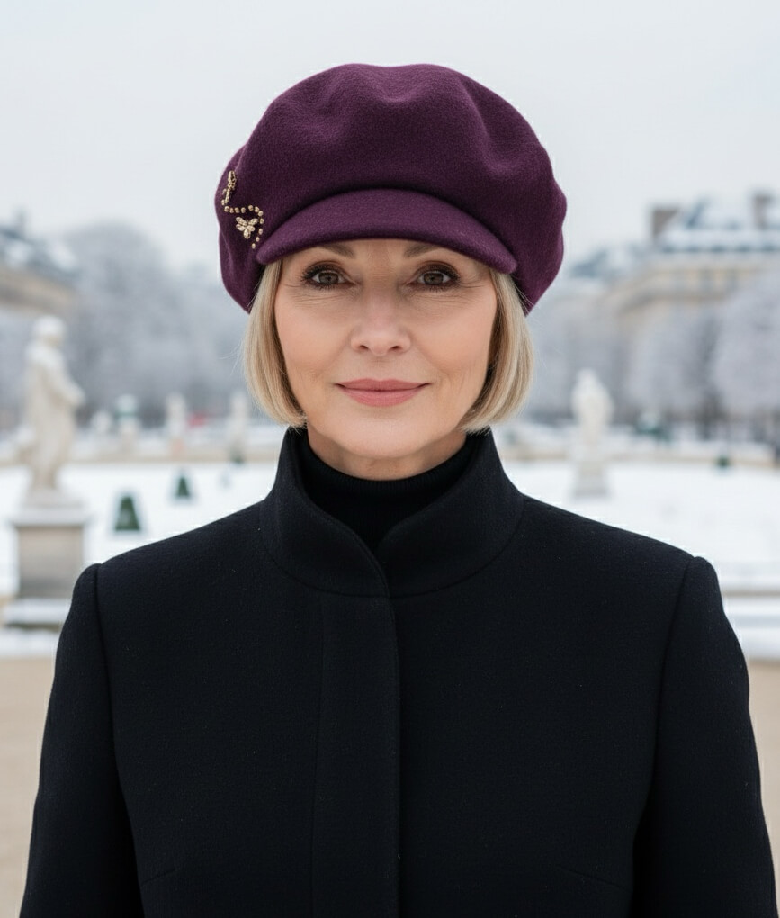 Culoarea violet inchis confera profunzime si rafinament. Este o nuanta intensa, sofisticata, care completeaza cu usurinta atat paltoanele in tonuri neutre, cat si tinutele in culori complementare. Violetul inchis inspira feminitate si stil, fiind o alegere potrivita pentru doamnele care isi doresc un accesoriu diferit, dar usor de asortat. Caciula de dama tip bereta cu cozoroc Cyprasa 6 in aceasta nuanta poate fi purtata atat in mediul urban, la birou sau la plimbari, cat si in vacantele de iarna.