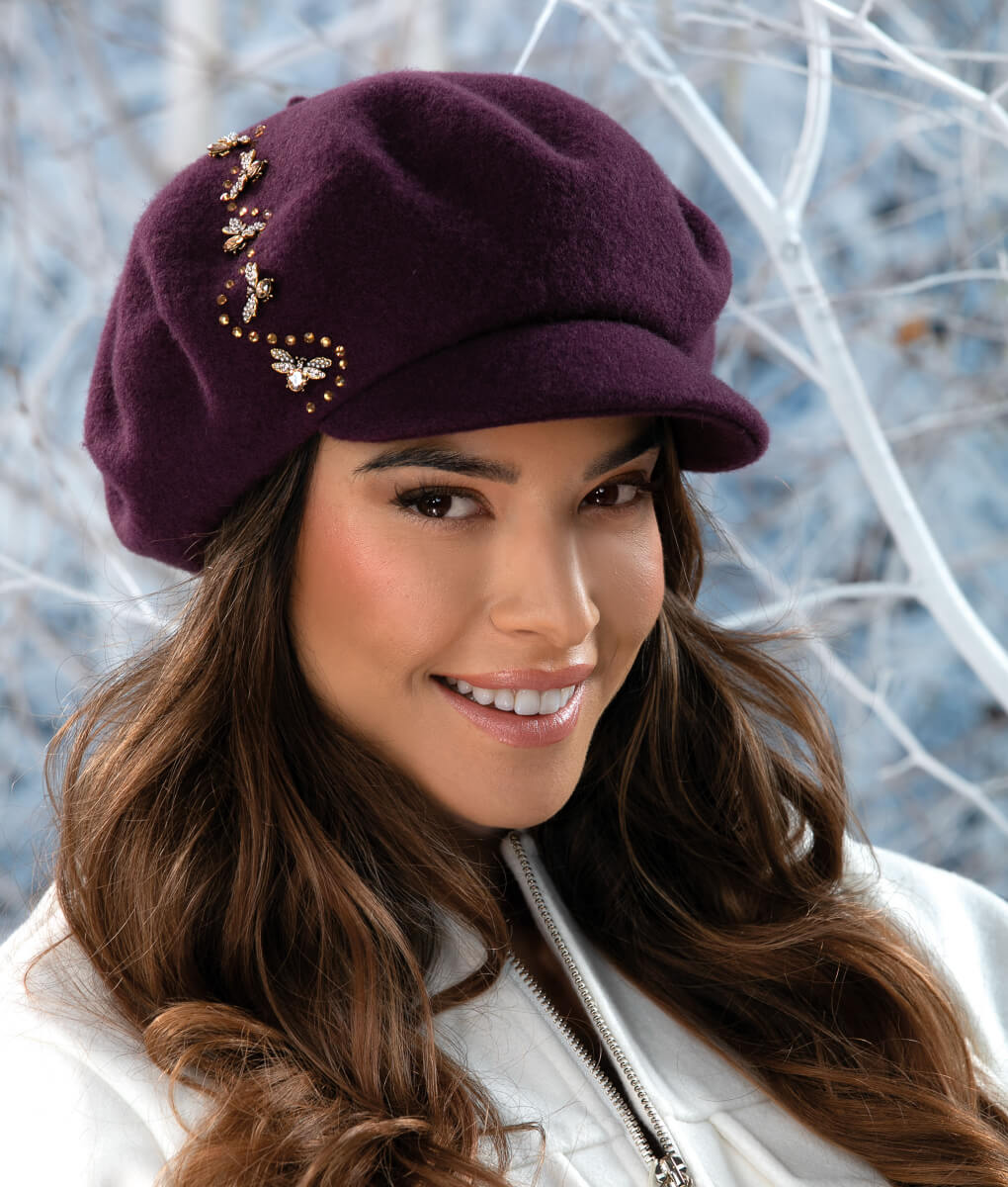 Un element distinctiv al modelului este decorul lateral cu strasuri si mici brose sub forma de albine. Aceste detalii adauga un plus de stralucire si personalitate, fara a incarca excesiv designul. Strasurile capteaza discret lumina, iar brosele in forma de albina completeaza armonios linia eleganta a beretei. Acest joc subtil de detalii transforma accesoriul intr-un punct de atractie al tinutei.