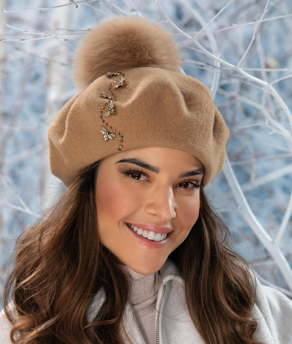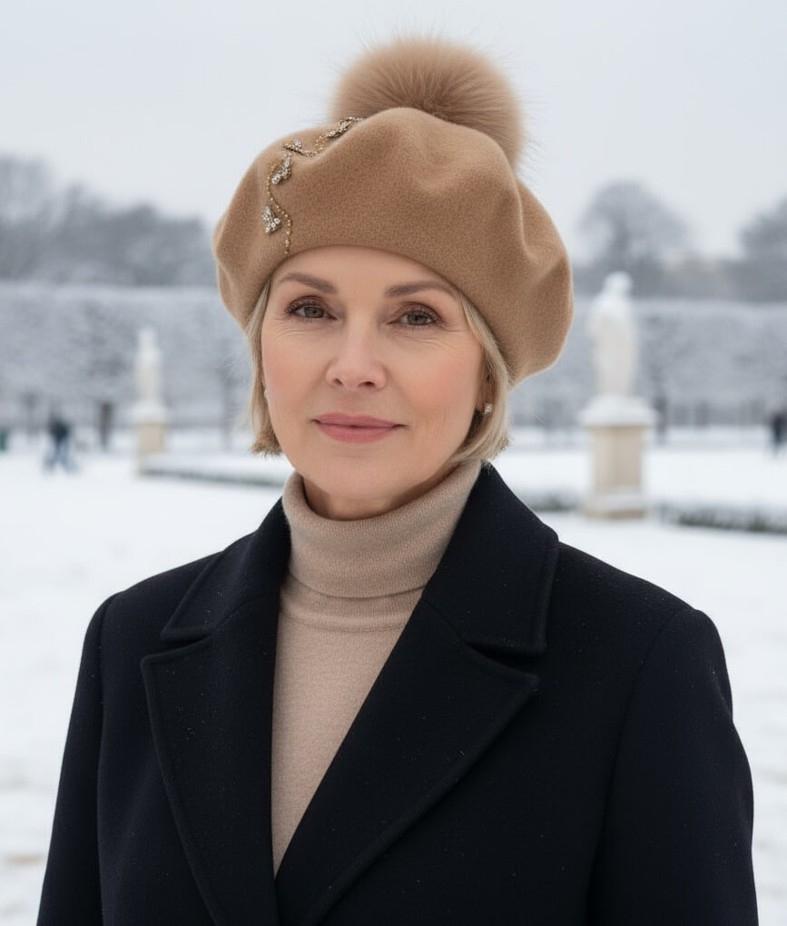 Un element distinctiv il reprezinta decorul lateral, compus din strasuri fine si mici brose sub forma de albine. Aceste detalii adauga un accent subtil de stralucire si o nota simbolica delicata. Strasurile reflecta discret lumina, iar albinele creeaza un punct de interes vizual care diferentiaza modelul. Caciula de dama tip bereta cu pompon din blanita Cyprata 3 capata astfel un caracter aparte, potrivit pentru femeile care apreciaza accesoriile cu personalitate.