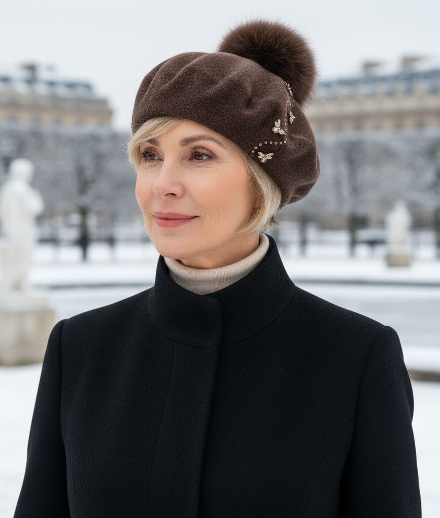 Decorul lateral este compus din strasuri discrete si mici brose sub forma de albine, un detaliu care adauga farmec si individualitate. Strasurile reflecta subtil lumina, iar albinele ofera un accent distinct, cu o simbolistica delicata. Caciula de dama tip bereta cu pompon din blanita Cyprata 5 devine astfel mai mult decat un accesoriu functional, transformandu-se intr-o piesa care completeaza tinuta si adauga un plus de feminitate.