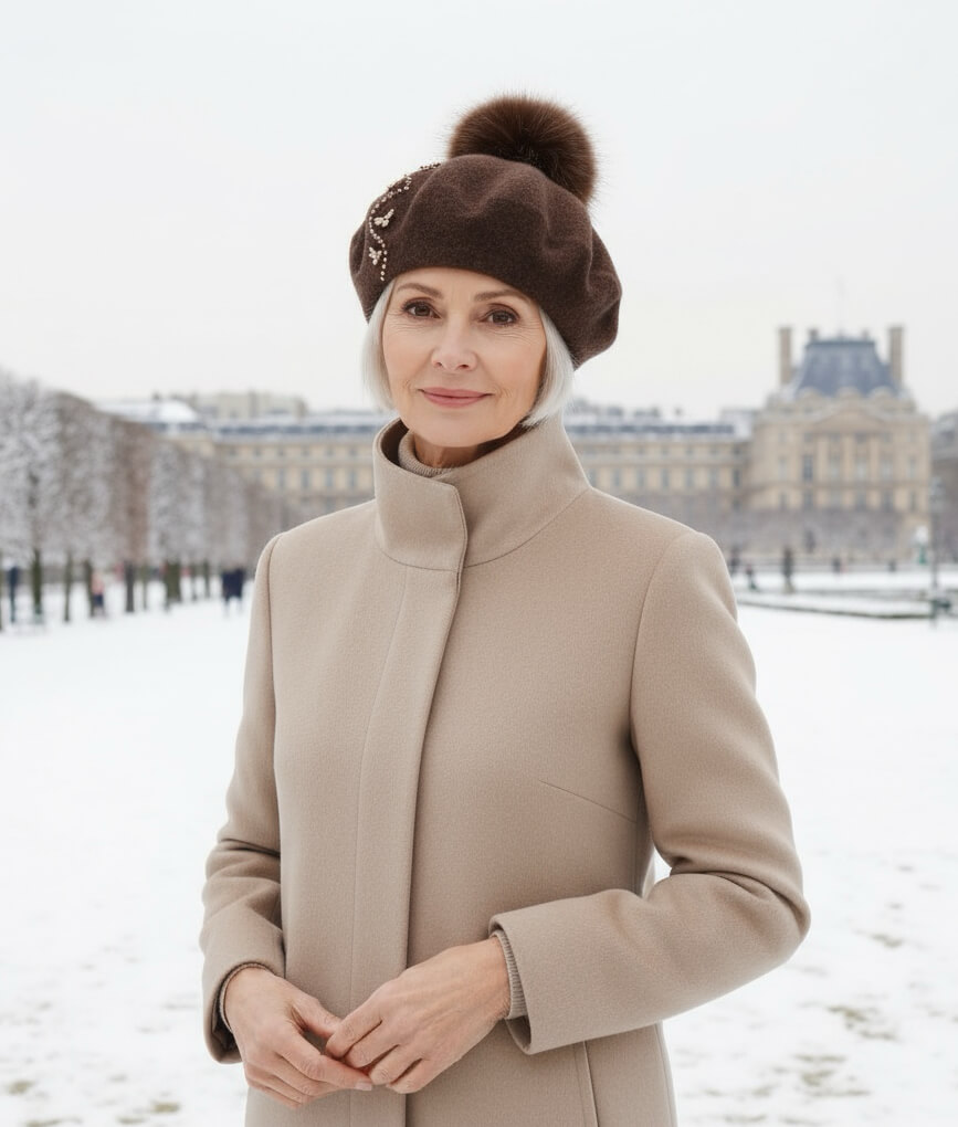 Culoarea maro inchis este usor de asortat si pune in valoare detaliile decorative. Caciula de dama tip bereta cu pompon din blanita Cyprata 5 poate completa tinute in tonuri neutre sau poate crea contraste interesante alaturi de culori deschise. Este un accesoriu versatil, creat pentru femeile care doresc sa combine confortul oferit de lana merinos cu un design atent realizat si cu detalii care fac diferenta in sezonul rece.