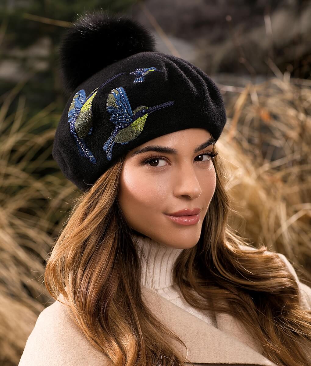 Caciula de dama tip bereta cu pompon din blanita Kenasa este un accesoriu elegant si bine definit, creat pentru femeile care apreciaza piesele clasice reinterpretate prin detalii artistice si materiale de calitate superioara. Acest model imbina sobrietatea culorii negre cu un decor rafinat, rezultand o bereta cu prezenta discreta, dar puternica.