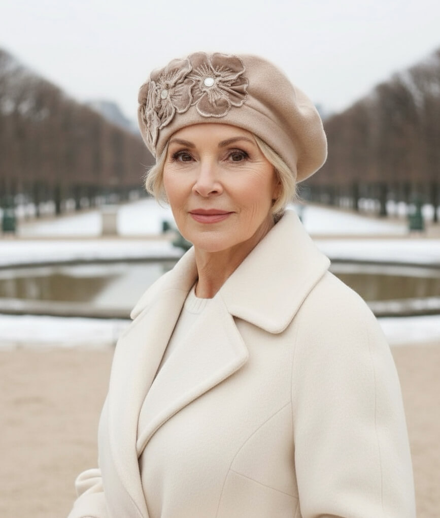 Caciula de dama tip bereta eleganta Ivetta sporeste starea de confort in timpul purtarii, facand-o ideala pentru zilele reci de toamna si iarna. Croiul atent conceput pune in valoare individualitatea si feminitatea purtatoarei. Designul sau versatil o face potrivita pentru o varietate de stiluri si tinute, fiind o piesa usor de asortat atat cu haine elegante, cat si cu cele casual. Caciula de dama tip bereta eleganta Ivetta se remarca prin decorul cu trei flori stilizate din catifea, avand in mijloc cate o margeluta stralucitoare, adaugand un aer romantic si sofisticat.