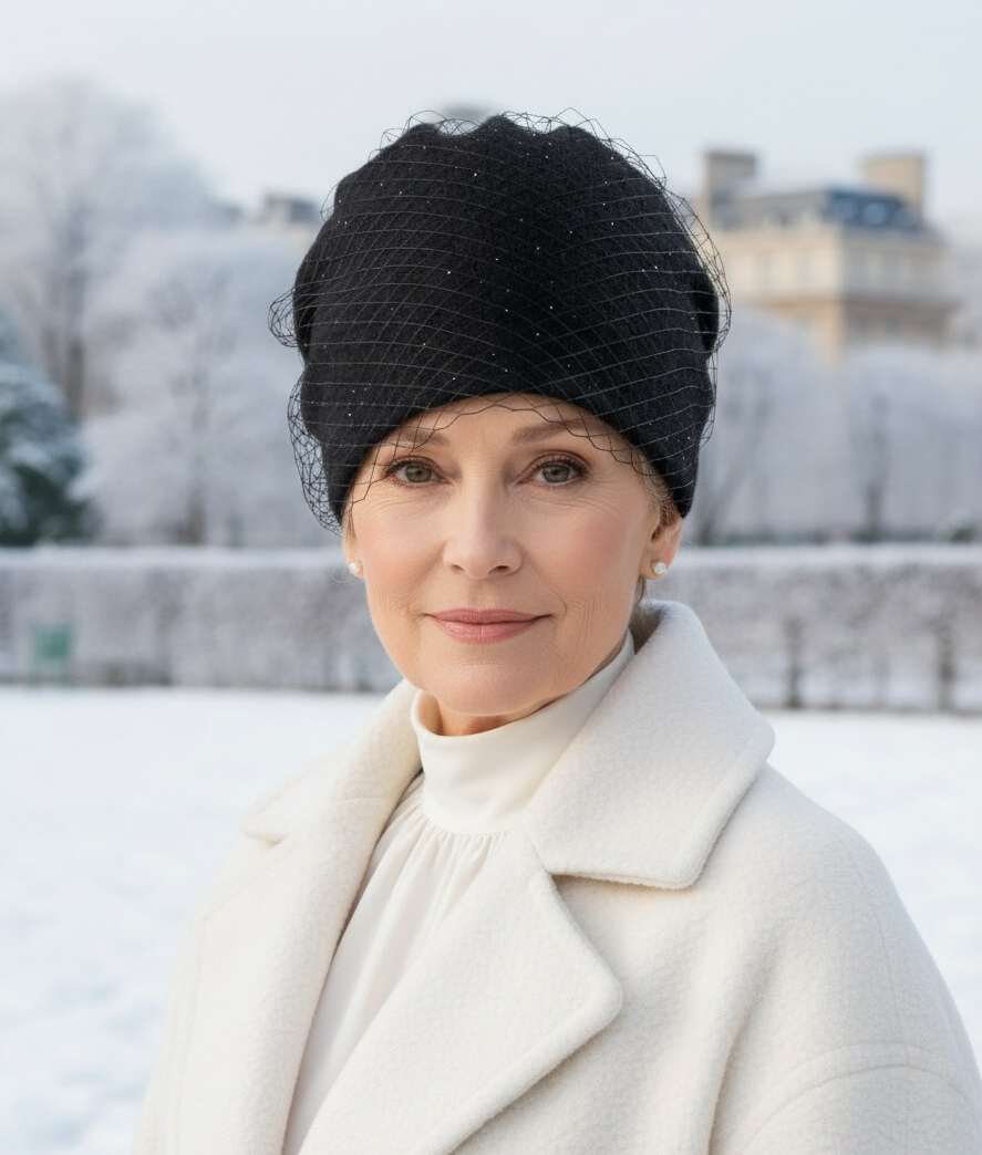 Partea din fata este accentuata de o aplicatie bogata, realizata din strasuri fine care reflecta discret lumina. Decorul este realizat in aceeasi nuanta cu materialul, ceea ce pastreaza un aspect unitar si elegant. Aceasta alegere cromatica pune in valoare textura tricotului si evidentiaza liniile designului. Peste aceasta zona decorativa este aplicata o voaleta fina care adauga profunzime vizuala modelului. Transparenta materialului creeaza un efect subtil si introduce o nota inspirata din estetica clasica. Prin acest element, caciula eleganta de dama Agafia 1 capata o imagine feminina si distincta.