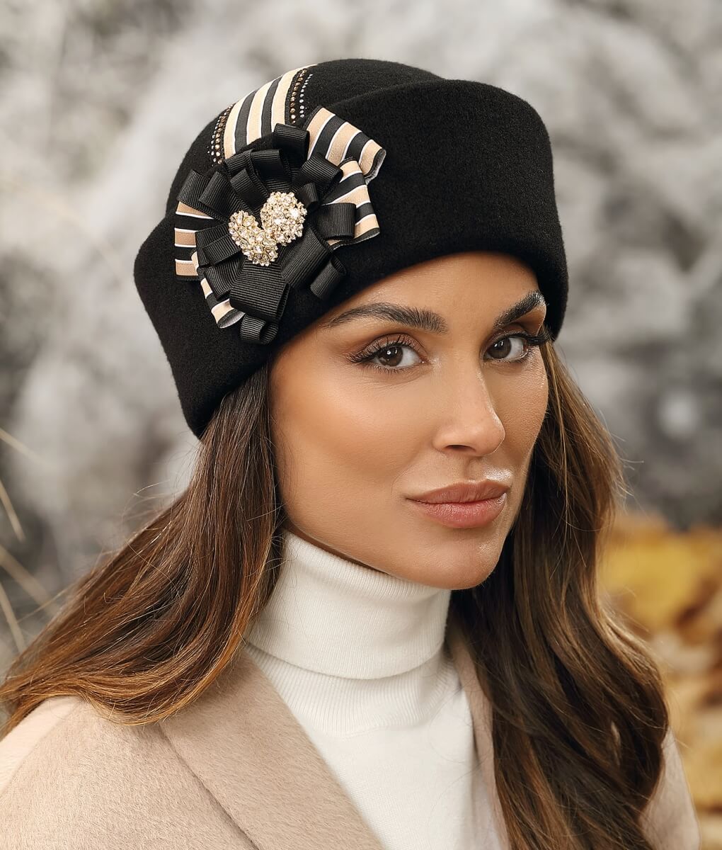 Designul este impresionant cu o bordura lata accesorizata cu fundite stilizate, banda decorativa in doua culori, brosa cu cristale si strasuri ce irizeaza in razele de lumina. Aceste accesorii adauga un plus de stil, transformand-o intr-o piesa unica si sofisticata. Caciula eleganta de dama Owiseva are accente romantice care o fac sa fie ideala pentru diverse ocazii, de la intalniri romantice sau evenimente formale, pana la zile obisnuite petrecute in oras sau la birou.